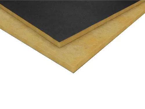 Panel de lana de vidrio revestido con un velo de color negro, lo que aporta aislamiento térmico y acústico.