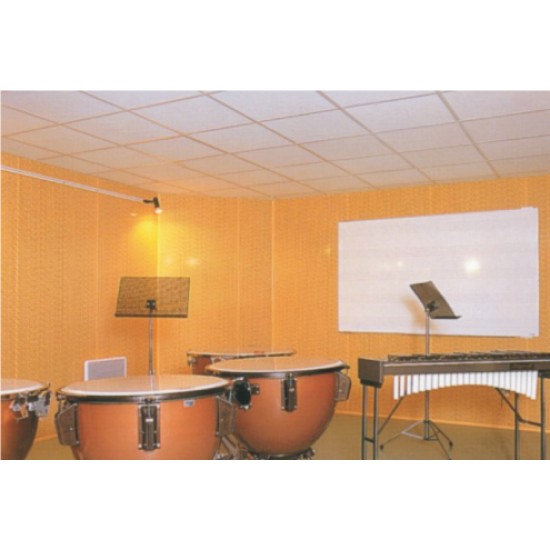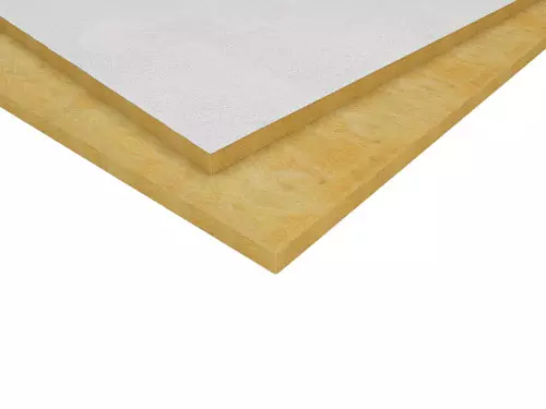 Panel de lana de vidrio revestido con un velo de vidrio blanco, mejorando la reflexión lumínica del ambiente.